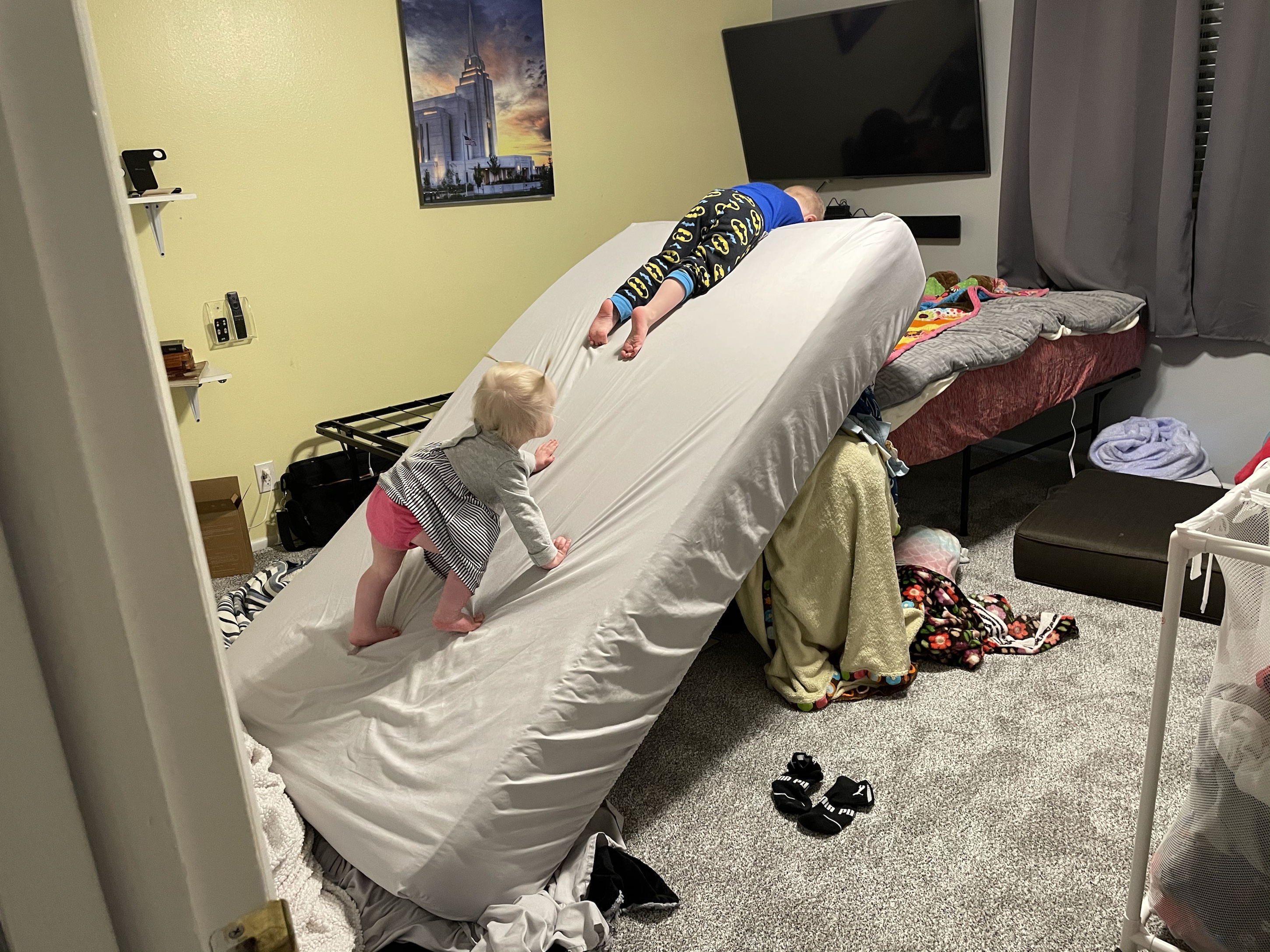 My cute kids turned our beds into a slide and played for such a long time. They are so funny! I???m glad they can be creative… even if it does make a big mess. 😄